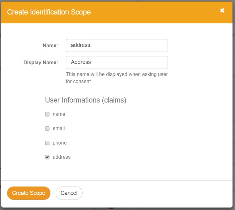 An Identity Scope has a name, display name and a set of claims. Login - Aprova Certificados provides a couple of default scopes that include basic user claims: